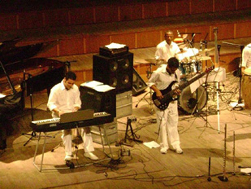 Pour la clôture du concours JoJazz 2007 il joue lors du Gala rendant hommage à Ernesto LECUONA. A la fin de 2008 Alejandro FALCÓN organise son propre cuarteto de jazz "CUBADENTRO" qu'il développe parallèlement à son rôle de pianiste de "Maraca" chaque fois qu'il se retrouve libre dans 'île. Ses partenaires sont Keisel JIMÉNEZ, drum; Sergio RAVEIRO, basse et Jorge MOLINA, congas. L'objectif est de développer un jazz fusionnant la musique classique et les racines de la musique cubaine. Le cuarteto puise ainsi son répertoire dans les oeuvres traditionnelles des grands compositeurs cubains "La Malagueña", "Las Alturas de Simpson", "Echale Salsita"... jazzéifiées, des classiques du jazz et des compositions de Alejandro qui délaisse momentanément le classique pour alimenter le répertoire de sa formation : "Eleguá Echú", "Callejones de húmedos recuerdos", "Ana", "Suite Conga", "Tumbao con Moña". Alejandro et Cubadentro aux Jardines del Mella avec El Greco comme invité. |