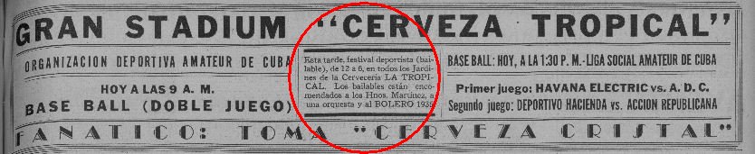 Dès le mois de mai la formation anime le Baile de las Flores à Guanabacoa puis en juillet celui de l’Association Canaria et du Club Progreso en août. Le même mois le septeto joue à La Tropical puis le mois suivant à la Polar est présent pour la Una tarde en el Oeste et son grand Rodéo. « Tata » et ses partenaires participent également au baile Despidiendo el Verano organisé par l’Alianza Juvenil de Guanabacoa puis à la Verbena Una Noche en mi Bohío. A Guanabacoa également le septeto joue pour la Fiesta Intersocial du Club Atlétic. En novembre, alors que l’orchestre de Cheo Belén PUIG joue au Casino Español de Regla, le « BOLERO 1935 » est également invité et côtoie alors le chanteur de l’orchestre Pablo QUEVEDO qui deviendra également son chanteur. Comme de nombreuses formations musicales le « BOLERO » est présent dans les cinémas pour jouer entre les pauses et en décembre on le retrouve au Tosca. Pour la veillée de Noël le septeto se déplace à Bejucal pour la grande fête des charangas et leur défilé de carrozas. |